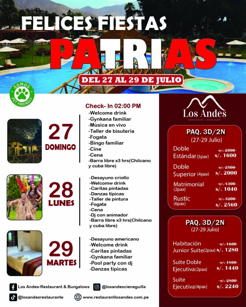 En Los Andes, puedes disfrutar de estas Fiestas Patrias,con diferentes paquetes especiales para que celebres con quienes más quieres en un ambiente natural, acogedor y lleno de tradición.